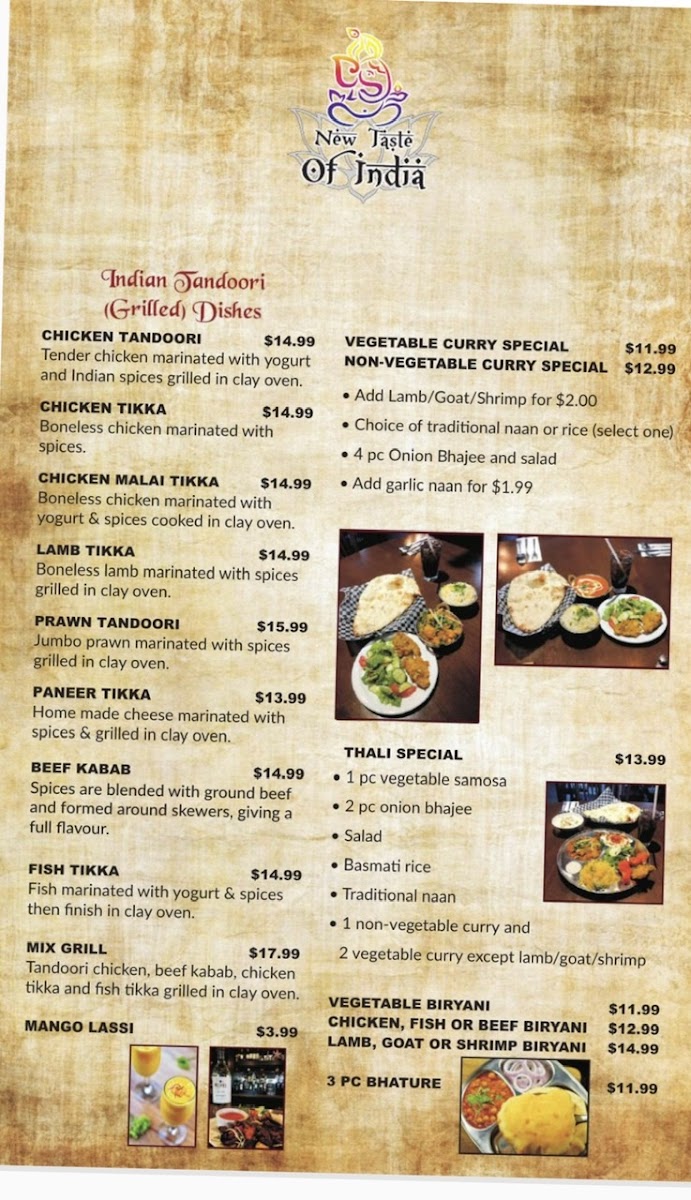 The New Taste of India Restaurant in Lethbridge offers a diverse and vibrant menu, filled with a variety of traditional Indian dishes, including tandoori specialties, curry options, vegetarian delights, Indo-Chinese dishes, and more. Starting with the Tandoori Specialties, guests can enjoy options like Murg Tandoori (Full) and Murg Tandoori (Half), both offering a deliciously smoky, charred flavor, or try the Hariyali Chicken Tikka for a herbal twist. For a more indulgent choice, the Chefs Special Mix Grill combines a variety of meats, while the Chicken Tikka delivers a simple yet satisfying option.