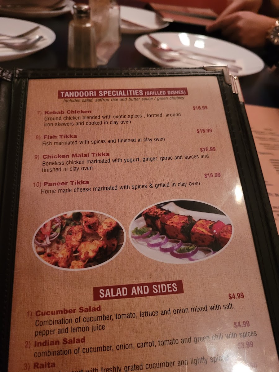 For starters, Onion Bhajee, Vegetable Samosa, and Chicken/Fish Pakora are must-tries, while the Chicken Lollipop brings a fun, savory bite to the table. Complementing these dishes are refreshing sides like Cucumber Salad, Indian Salad, and tangy Raita.