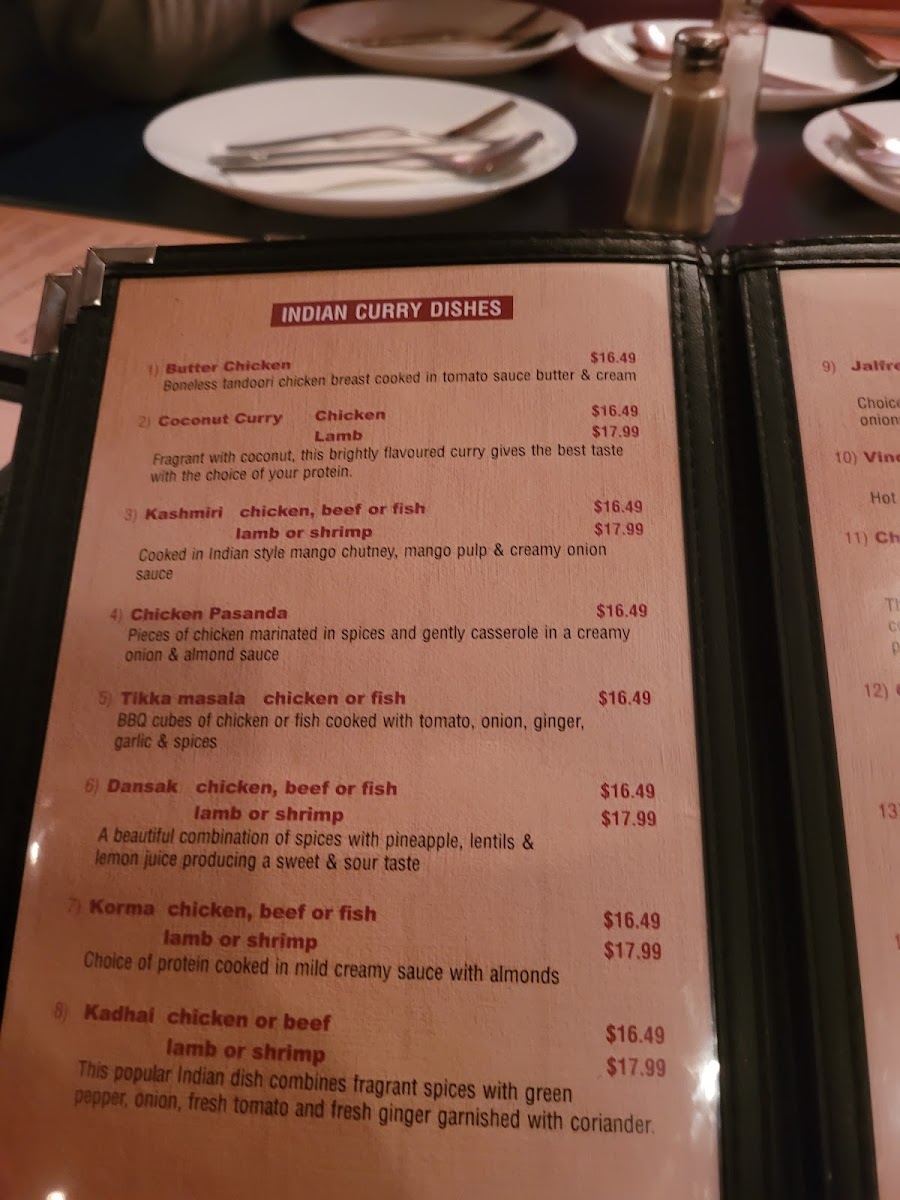 The Indian Curry Dishes are a highlight of the menu, featuring rich, flavorful choices such as the beloved Murgh Makhani / Butter Chicken, a creamy, comforting dish, and the Coconut Curry Chicken and Coconut Curry Lamb, which are aromatic and slightly sweet. For those looking for something unique, the Kashmiri Chicken or Kashmiri Lamb, along with Beef or Fish, bring a perfect balance of spices with a mild heat. Seafood lovers can also opt for Kashmiri Shrimp for a vibrant, tangy curry experience.
